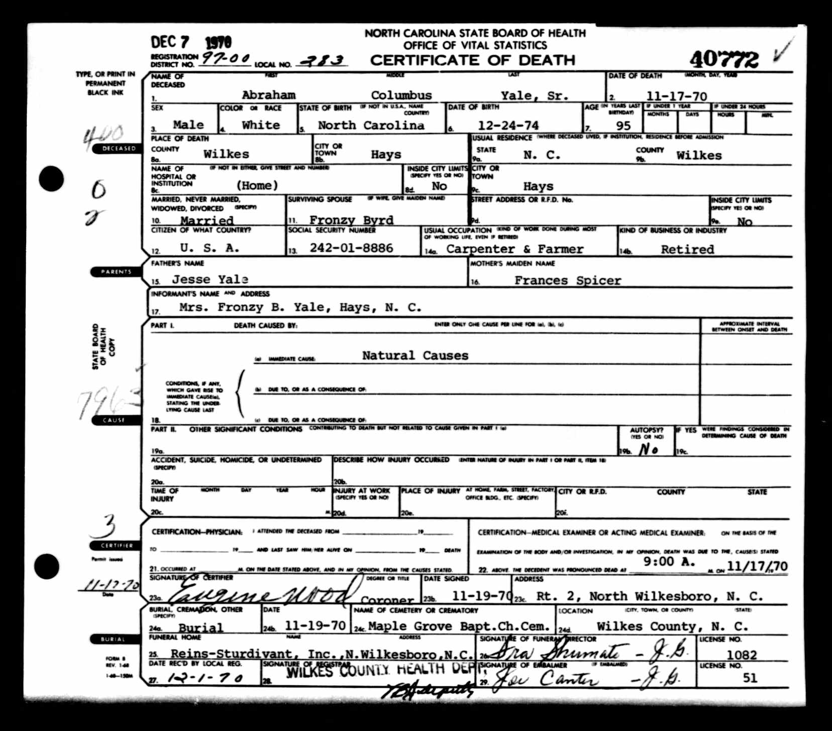 North Carolina, Death Certificates, 1909-1975